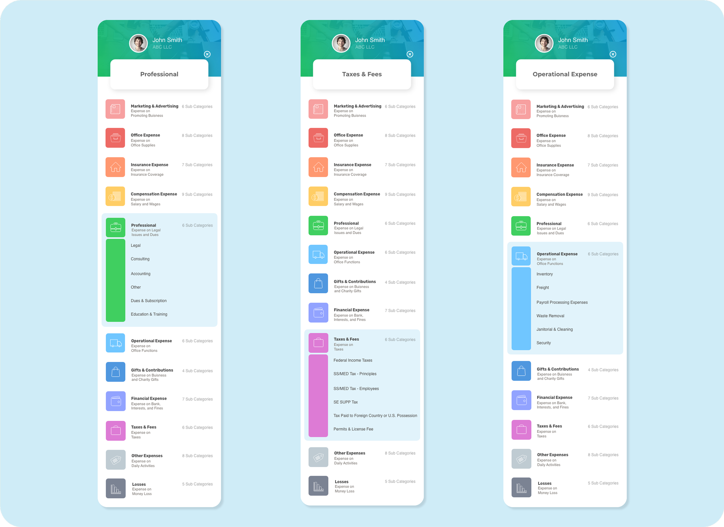 I built a categorization hierarchy (Assets, Liabilities, Equity, Income, Expense) and developed subcategories using data from Excel spreadsheets provided by the company. Then, matched each category with a unique color and icon to aid recognition while inputting transactions.